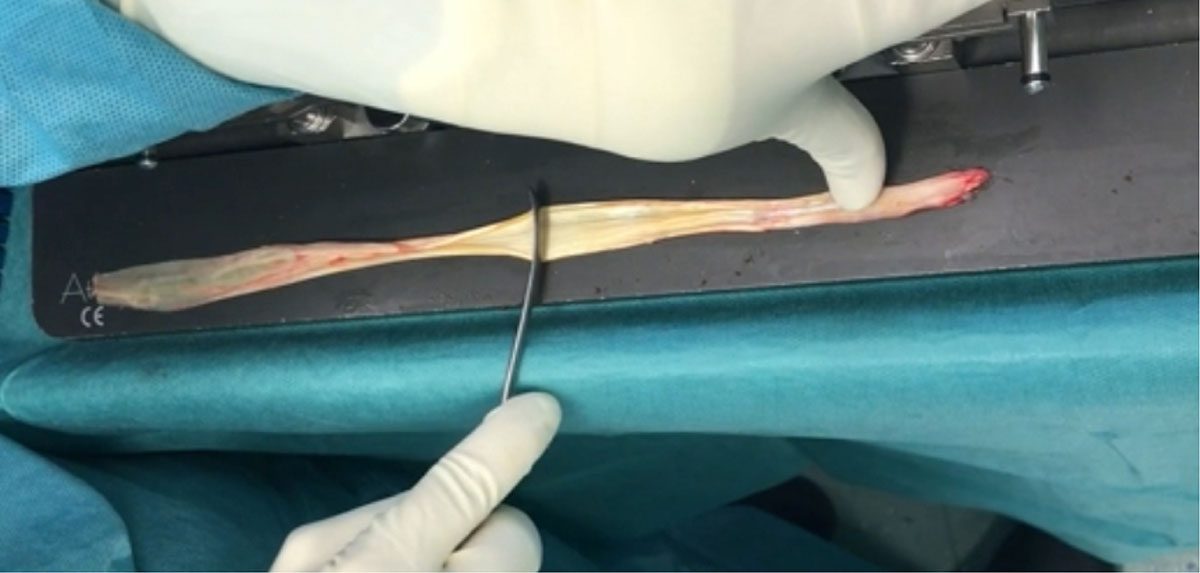 Abb. 4 a Einschneiden einer tubulären Semitendinosussehne im Faserverlauf.