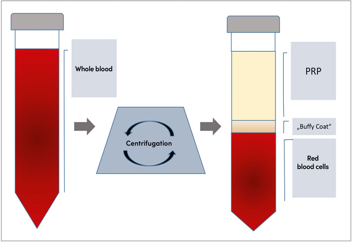 So-called platelet-rich plasma is the plasma fraction separated from whole blood in which the platelets are enriched above their concentration in whole blood, usually by centrifugation. In contrast to the US, in Germany there are no specifications prescribing which concentration a procedure must achieve in order to be called a PRP product and be marketed. As a rule though, a concentration of about 2 – 5 times should be gained in order to obtain a therapeutic benefit. During centrifugation the blood components are separated according to their size and weight. In the uppermost layer there is a concentration of plasma (incl. the dissolved proteins) and platelets, but also of cell fragments/components etc. The heavier and larger red blood cells sink to form a deep layer at the bottom. In the intermediate layer between these two fractions a zone forms that contains an increased number of white blood cells, the so-called buffy coat. Depending on whether fractions of this intermediate layer are removed or separated with other fractions this forms leukocyte-poor PRPs (lp-PRP) or leukocyte-rich PRPs (lr-PRP). Equally, the upper layer can be separated again after initial centrifugation. This contains particularly platelet-rich fraction or platelet-poor serum (PPP). Whether the presence of leukocytes in the PRP potentiates the desired effect has long been the subject of controversy and has certainly not been scientifically established. A growing number of studies are indicating that leukocyte-rich PRP is particularly effective for insertion tendinosis, for example in lateral epicondylopathy at the elbow. In contrast, other papers report that a high concentration of immune cells promotes a catabolic and inflammatory metabolic status which, for example, could have a negative effect on wound healing processes. The overview is further complicated by the fact that treating the blood before centrifugation has an effect on the composition of the subsequent preparation. For instance, untreated autologous blood can be centrifuged as in, for example, ACP® (Autologous Conditioned Plasma) from the Arthrex Co., or conditioned, for instance, by an incubation phase or by adding bioactive substances such as citrate, EDTA, or certain cytokines. This is then called autologous conditioned serum (ACS).