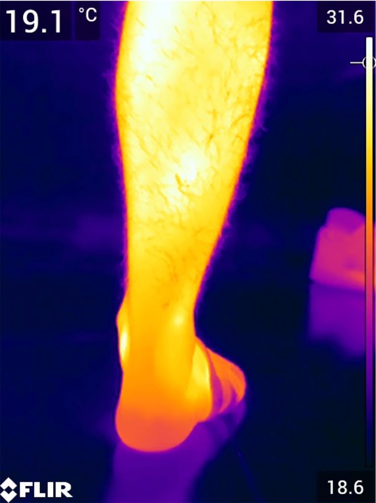In der von uns eingesetzten Infrarotthermographie (FLIR E75 Wärmebildkamera, Abb. 1) werden mit der Kamera mehr als 75.000 Messpunkte mit einer thermischen Empfindlichkeit von < 0,04 Grad Temperaturdifferenz dargestellt und somit auch kleine Flächen einer Hyperämie (Triggerpunkte) sicher nachgewiesen. Das Wort „trigger“ kommt aus dem Englischen und kann mit „Auslöser“ übersetzt werden. Unterschieden werden kann zwischen den aktiven myofaszialen Triggerpunkten, die häufig überaus schmerzhaft sind und den betroffenen Muskel oftmals abschwächen, latenten myofaszialen Triggerpunkten, die nur in der Bewegung schmerzhaft sind und assoziierten Triggerpunkten, die durch Funktionsstörungen der benachbarten Muskelgruppen entstehen. Zunehmend wird in letzter Zeit auch eine differenzierte EMG-Diagnostik in Verbindung mit der Thermographie eingesetzt, um Ansteuerungsprobleme der Muskulatur parallel zu erkennen und mit Hilfe des Biofeedbacktrainings zu korrigieren. Initial kam die Thermographie vor allem im Bereich der wirbelsäulennahen Muskulatur zur Anwendung, um schmerzhafte Muskelverspannungen im Bereich der HWS/LWS zu erkennen und gezielt an diesen Strukturen zu arbeiten. Im vorliegenden Fall ist die Indikation zur Wärmebilddiagnostik auf den Bereich „Achillessehnenbeschwerden“ ausgeweitet worden.