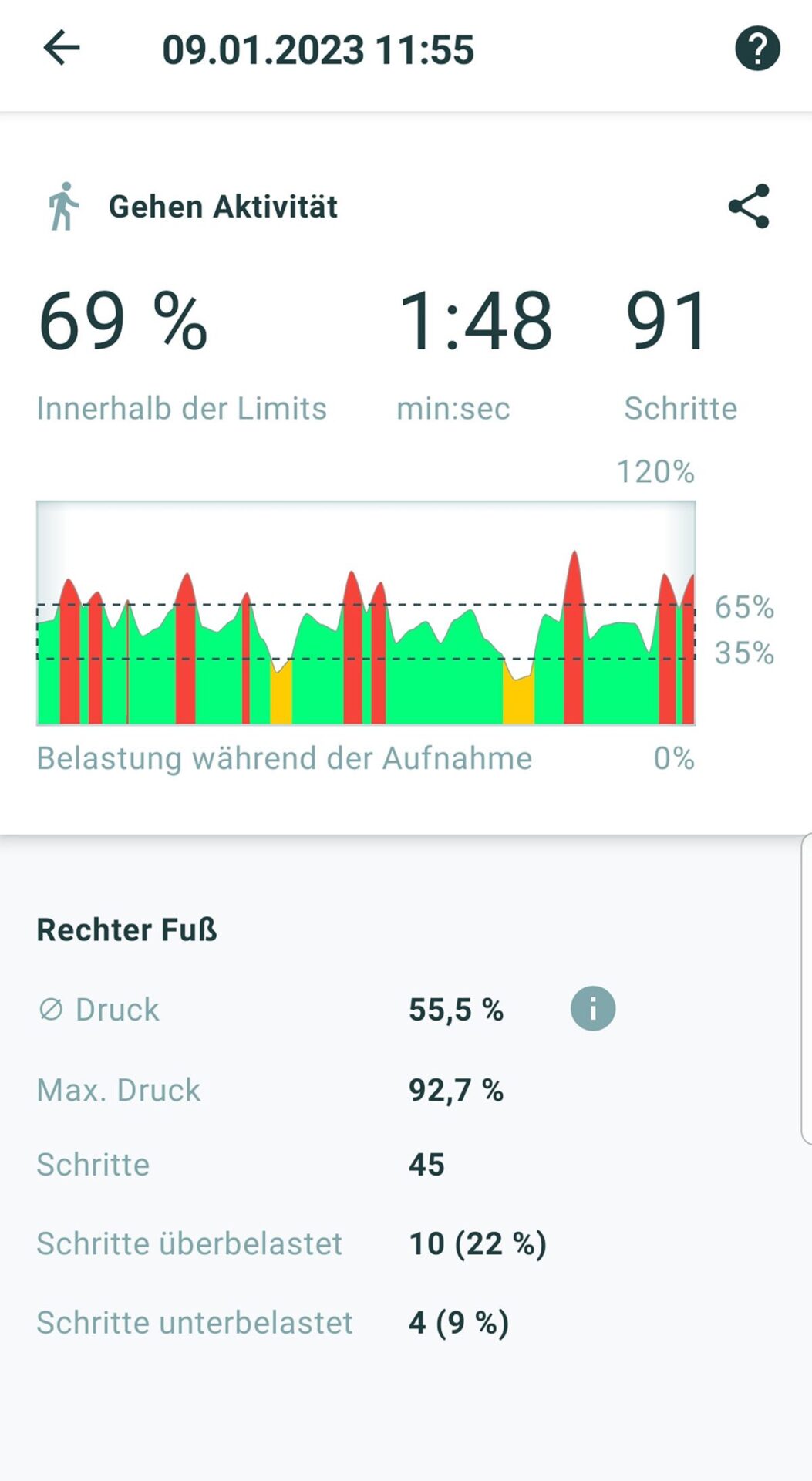 Pneumonieprophylaxe, Dekubitusprophylaxe, Kryotherapie, Transferschulung (Rückenlage-Sitz-Stand und retour), aktive Bewegungsmaßnahmen der angrenzenden Gelenke. Passive Bewegungsschulung des Kniegelenks mittels Motorschiene im vorgegebenen Ausmaß, Gangschulung mittels zwei Unterarmstützkrücken unter Einhaltung der TB von 15 – 20 kg mittels Messsohlen und dazugehöriger App auf der Ebene und an der Stiege. In einer Pilotstudie, durchgeführt im AUVA Unfallkrankenhaus Klagenfurt am Wörthersee, wurde die Anwendung der stappone-Messsohlen (Schuheinlage) mit dazugehöriger APP, stapp one rehab (beides stAPPtronics GmbH), mit Live-Feedback (Abb. 1) und Benutzungsreport (Abb. 2), als unterstützend eingestuft und es zeigte sich ein starker Trend, die Compliance bei der Einhaltung der TB-Vorgabe positiv beeinflussen zu können. Stationäre Entlassung am vierten postoperativen Tag.