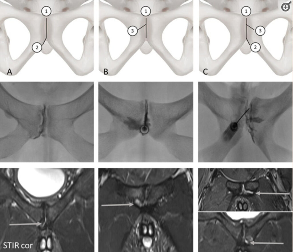 Die MRT-Diagnostik ist entscheidend für die Abklärung. Typisch sind Spaltbildungen an den Sehnenansätzen und Veränderungen des PLAC (Pyramidalis – anterior pubic ligament – adductor longus complex). Hierbei ist der adductor longus eine zentrale Struktur. Neben der Nativ-MRT sind auch eine KM-MRT Symphysiographie mittels lokaler Gadolinium / Kortikoid Applikation sowie eine ergänzende CT in manchen Fällen sinnvoll.