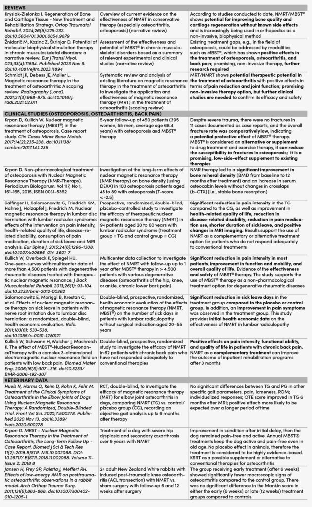 NMRT can, among other things, modulate circadian rhythms or the cellular clock, hypoxia signaling pathways (HIF-1α), and mitochondrial metabolism based on quantum biology, reduce inflammation markers, and activate regenerative signaling pathways. In addition, NMRT has been shown to promote nerve regeneration in animal models, contribute to regenerative cell proliferation in-vitro (e.g., chondrocytes, osteoblasts), and improve the conditions of the extracellular matrix3. The therapeutic effect of this unique combination of magnetic fields and radiofrequency sequences appears to be more effective than the individual components. Physiological regeneration processes can thus also be supported in a targeted and even tissue-specific manner with this physical therapy modality. Symptoms can be alleviated and, in many cases, the pathology can also be addressed causally. Magnetic resonance therapy is increasingly being used worldwide by therapists in various practice settings, but also by sports clubs for various indications and tissue types in cases of complaints, injuries, and painful, degenerative, and / or pathological changes in the musculoskeletal system (Fig. 1) as part of multimodal therapy1, 2. The clinical-scientific collaborations consist of international cooperation between universities, clinics, and practices, as well as professional sports clubs such as HSV and Wrexham AFC. In addition to practical clinical experience from over 20 years of MBST® with various case reports and company vigilance data, the clinical data also includes current reviews and older retrospective and prospective data collections, primarily in the areas of back pain, osteoarthritis, and osteoporosis (Clinical Evaluation Report, 2022). The table below provides a summary overview of the most relevant clinical data on magnetic resonance therapy. In summary, clinical study data show that NMRT leads to good pain reduction in osteoarthritis, contributes to an increase in bone density in osteoporosis, reduces sick days in back pain, and can improve the rehabilitation effect, e.g., due to pain reduction.