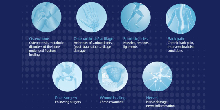 Here, it has been shown that delayed fracture healing (delayed to non-union/pseudarthrosis), “problem fractures” such as subtrochanteric femoral fractures, scaphoid fractures, complex bone fractures such as tibial plateau fractures or calcaneal fractures, and osteoporotic vertebral fractures also benefit from NMRT as an adjuvant conservative treatment and postoperatively. In the above setting, this is usually combined with shock wave therapy (ESWT), ultrasound, and a nutritional concept.
