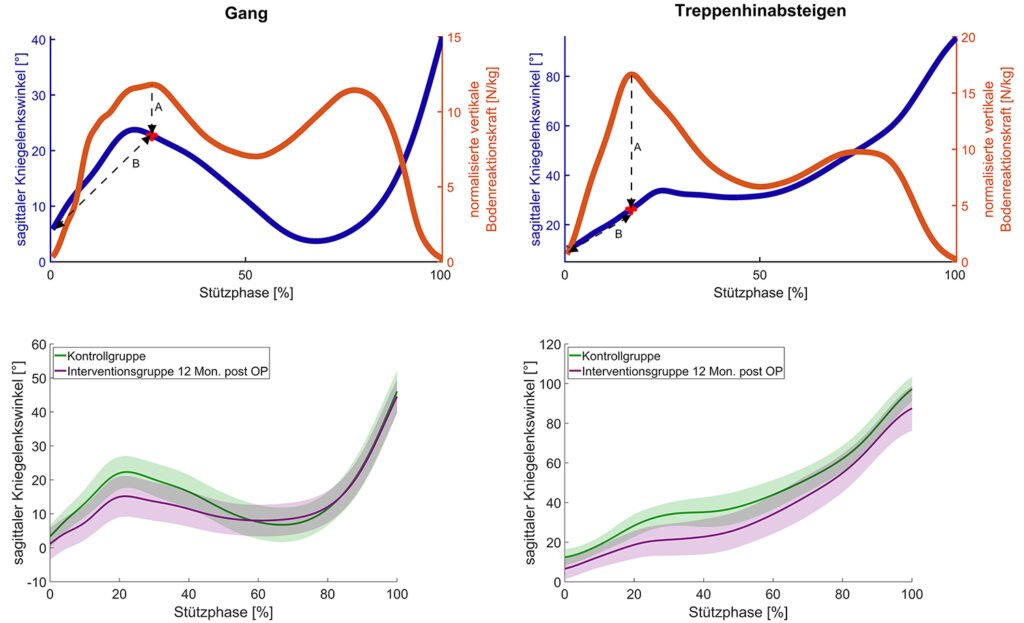 B: Differenz von Punkt A zum sagittalen Kniegelenkswinkel bei Initialkontakt. Zeile 2: Vergleich des sagittalen Kniegelenkswinkels zwischen Kontrollgruppe und Interventionsgruppe 12 Monate post-OP.
