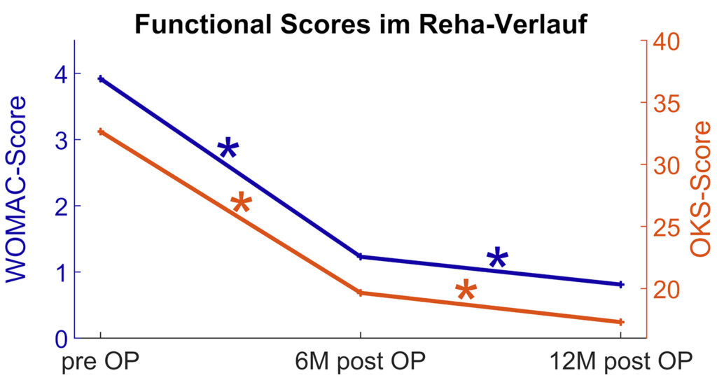 Die Ergebnisse zeigen, dass die Patienten bereits sechs Monate nach der Operation über eine signifikante Verbesserung von Funktion und Beschwerdesituation im Vergleich zum präoperativen Level berichteten, die sich bis zwölf Monate post-OP weiter steigerte (Abb. 3). Die größten Funktionseinschränkungen zwölf Monate post- OP gaben die Patienten noch beim Treppenabsteigen (Score: 1,52), gefolgt von anstrengenden Hausarbeiten (Score: 1,25) im WOMAC-Score an. Die Bewegungsanalyse vom Gang und Treppenabsteigen verdeutlicht eine signifikante Verbesserung der biomechanischen Parameter der Sagittalebene zwischen sechs und zwölf Monate post-OP. Jedoch sind auch noch 12 Monate post-OP auffällige Unterschiede der exzentrischen Knieflexion und des maximalen Knieflexionswinkels im Vergleich zur Kontrollgruppe festzustellen. Beim Treppenabsteigen ist der Knieflexionswinkel zum Zeitpunkt der maximalen vertikalen Bodenreaktionskraft um 10,6° geringer im Vergleich zur Kontrollgruppe [p < 0,001] und das Bewegungsausmaß um 5,4° [p < 0,001].