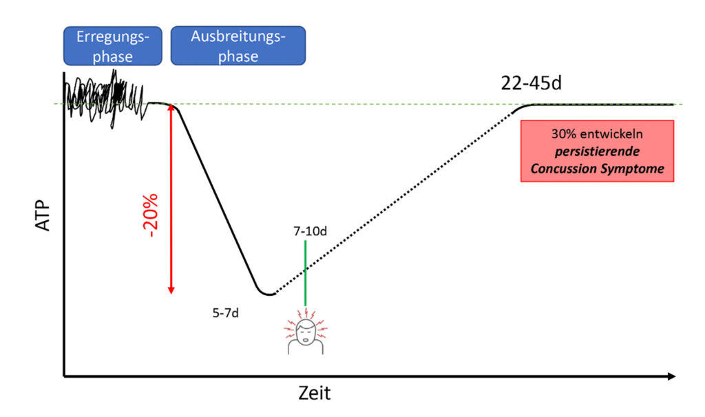 mit ATP-Abfall um ca. 20 %, Tiefpunkt nach 5 – 7 Tagen. Symptome klingen meist nach 7 – 10 Tagen ab, während die metabolische Erholung über drei Wochen hinaus verzögert bleibt. (Modifiziert nach dem Lehrkonzept von Complete Concussion)
