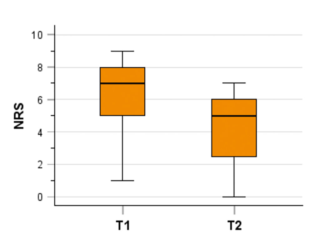 The median NRS was 5 points in T2, which was significantly lower than in T1 with 7 points (Wilcoxon test for paired differences, p < 0.001). The NRS thus showed a significant reduction in pain intensity between T1 and T2.