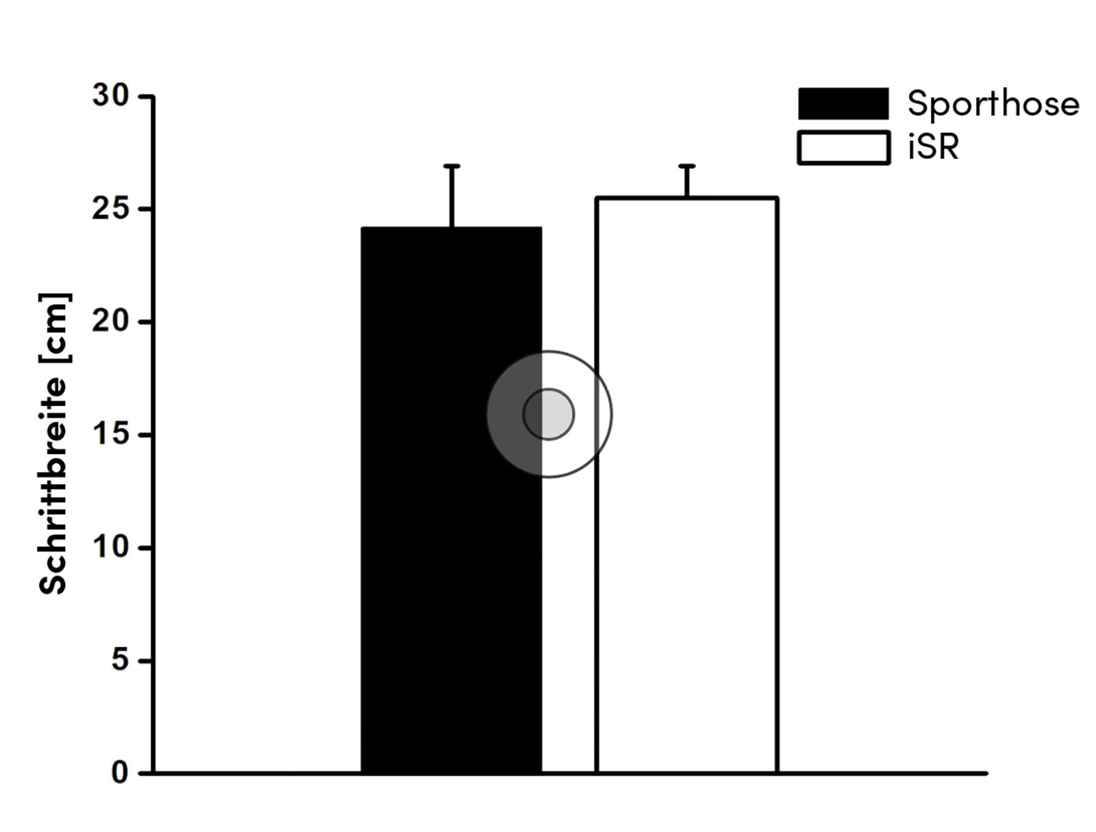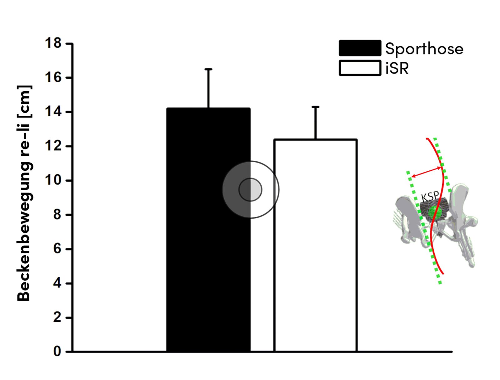 Qualitativ ließ sich unter der Verwendung der iSR ein deutlich stabileres, wiederholbareres und harmonischeres Gangbild erkennen. Die Cross-Over-Schritte mit einhergehenden Instabilitäten waren nicht mehr zu erkennen und wurden eliminiert. Entsprechend waren die ausgleichenden Armbewegungen sowie die Oberkörperbewegungen deutlich reduziert. Insgesamt wirkte der Bewegungsrhythmus gleichmäßiger, die Gangbewegung weniger unterbrochen und sequenziell und dadurch stabiler. Die Ganggeschwindigkeit blieb unter den zwei Bedingungen (ohne Unterstützung: 0,44 m/s ± 0,01; iSR: 0,43 m/s ± 0,06) unverändert. Das oben qualitativ als stabiler beschriebene Gangbild lässt sich auch quantitativ zweifelsfrei nachweisen: Die Spurbreite war unter Verwendung der iSR um etwa 5 % (24,2 cm ± 2,7 vs. 25,5 cm ± 1,4) erhöht, was bedeutet, dass die seitliche Unterstützungsfläche vergrößert und damit die dynamische Stabilität verbessert ist. Gleichzeitig zeigt sich eine um ca. 10 % reduzierte Lateralbewegung des Beckens (14,2 cm ± 2,3 vs. 12,4 cm ± 1,9). Dieses deutlich geringere Rechts-Links-Schwanken erhöht zusätzlich neben der erhöhten Spurbreite die dynamische Stabilität (Abb. 3). Auch die Variabili-tätskoeffizienten dieser zwei Parameter sind unter Verwendung der iSR reduziert, d. h. die Bewegung ist wiederholbarer, was sich vor allem bei der Spurbreite niederschlägt (Variabilitätskoeffizient Spurbreite: 11,2 % vs. 5,5 %; Beckenbewegung: 16,2 % vs. 15,3 %). Der horizontale Abstand des Körperschwerpunkts (KSP) zum Fußaufsatzpunkt in Bewegungsrichtung, ein Surrogatindikator für eine Körperrücklage zum Zeitpunkt des Fußaufsatzes, blieb von den unterschiedlichen experimentellen Bedingungen unbeeinflusst (27,2 cm ± 0,5 vs. 27,8 cm ± 1,7). Bei konstanter Ganggeschwindigkeit bedeutet dies, dass sich die dynamische Stabilität in Gangrichtung nicht beeinflusst zeigt (Abb. 4).