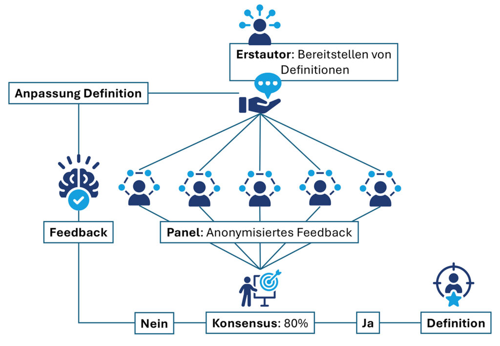 Die Autoren führen dieses Ergebnis auf Limitationen im Wissenschaftstransfer zurück, dessen Aufgabe es ist, wissenschaftliche Erkenntnisse in der alltäglichen praktischen Anwendung zu implementieren. Dieser Prozess wird als langwierig angenommen und kann nach aktuellen Schätzungen im Einzelfall bis zu 17 Jahre dauern [9]. Erschwerend kommt hinzu, dass keine einheitlich verwendeten Definitionen zu den unterschiedlichen Dehnungsarten existieren. Um diesen Limitationen entgegenzuwirken und den Transfer aus der Wissenschaft in die Dehnungspraxis zu beschleunigen, wurde ein internationales Expertengremium gebildet. Das Team aus 20 internationalen Forschenden nutzte für die Erstellung seiner Dehn-Empfehlungen das so genannte Delphi-Konsensus-Verfahren (Abb. 1). Bei diesem erhalten die Panel-Mitglieder Aussagen in anonymisierter Form.