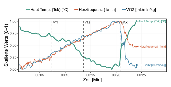 Neuste Erkenntnisse zeigen, dass die Ausprägung dieses Musters während körperlicher Last einen Zusammenhang mit der kardiorespiratorischen Fitness aufweist [17, 20]. Auch Kapoor et al. [21] und Jastrzębska et al. [22] fanden signifikante Zusammenhänge zwischen aerober Ausdauerleistungsfähigkeit und der belastungsinduzierten Tsk-Variation. Komplexitätsbasierte Kennwerte wie die Entropie der Temperaturverteilung, vor allem im Brustbereich korrelieren teils stärker mit physiologischen Referenzgrößen als der Tsk-Mittelwert eines Hautareals [17]. Damit eignet sich laut Hu et al. 2025 [23] und Ciu et al. 2025 [24] das Temperaturverteilungsmuster zur Bestimmung und Überwachung der internen körperlichen Beanspruchung. Bestrebungen gibt es ebenso, die IRT zur nichtinvasiven Detektion von metabolischen Schwellen einzusetzen, die exakte Bestimmung oder das Identifizieren von Gesetzmäßigkeiten gestaltet sich aufgrund der hohen Individualität des thermophysiologischen Systems jedoch nach wie vor als Herausforderung [25].
