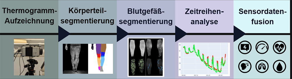 Um das volle Potenzial der IRT im Bewegungskontext auszuschöpfen, wird empfohlen, automatisierte und reproduzierbare Analysestrategien einzusetzen. Allerdings wird die Thermogrammanalyse in einschlägigen Forschungsarbeiten weitestgehend noch mit manuellen oder nicht näher spezifizierten Analyseverfahren durchgeführt [30]. In unserer Forschungsarbeit haben wir durch den Einsatz von tiefen neuronalen Netzen erstmals ein automatisiertes, reproduzierbares und zeitlich kontinuierliches Analyseverfahren zur Erfassung der Tsk und Detektion blutgefäßassoziierter-Temperaturverteilungsmuster während des Gehens, Laufens und Radfahrens entwickelt und evaluiert [31, 32].