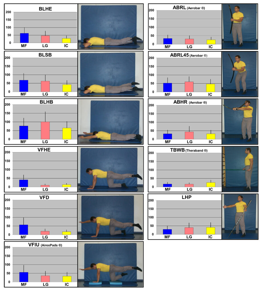 Die Messergebnisse für alle autochthonen Rückenmuskeln finden sich in Abb. 3 und Tab.1. Dabei beziehen sich die Angaben auf % MVC. Eine Trennung nach Geschlecht wird an dieser Stelle nicht berücksichtigt. Die höchsten Aktivierungen für den MF traten erwartungsgemäß bei den Übungen in Bauchlage auf, angeführt von den Hackbewegungen; die niedrigste bei den schnellen Wechselbewegungen mit dem Theraband®. Die Ergebnisse wurden in einem anderen Kontext und Umfang auf dem zwölften Jahreskongress des European College of Sport Science in Jyväskylä vorgestellt. [30]