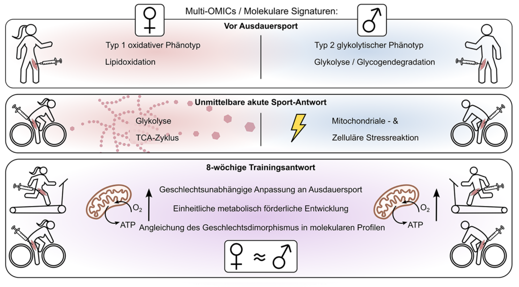 Die Skelettmuskulatur ist nicht nur für unsere Bewegungen verantwortlich, sondern auch der zentrale Motor des Stoffwechsels. Sie macht rund ein Drittel bis fast die Hälfte des Körpergewichts aus und ist der Hauptort, an dem Zucker und Fette verbrannt werden [1]. Dass Männer und Frauen sich dabei unterscheiden ist zwar seit einigen Jahren bekannt, wurde aber lange Zeit unterschätzt [2]. Frauen gelten als „fettverbrennungsstärker“, Männer als „glukosegetriebener“. Doch wie tief diese Unterschiede im Muskel verankert sind und wie Training sie verändern kann, war bislang kaum verstanden. Gerade bei Menschen mit Übergewicht oder Adipositas ist diese Frage von hoher praktischer Relevanz, denn sie haben ein erhöhtes Risiko, an Typ-2-Diabetes oder Herz-Kreislauf-Erkrankungen zu erkranken. Regelmäßiges Training gilt hier als wirksamste nicht-medikamentöse Maßnahme. Aber profitieren Frauen und Männer auf die gleiche Weise oder muss man sie in der Trainingssteuerung gezielt unterschiedlich ansprechen?