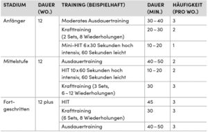 Wichtig ist also, nicht allein auf den ­Gewichtsverlust zu fokussieren, sondern auf den Fitnesszustand des Patienten und die Körperzusammensetzung [10 – 13]. Training und Bewegung sind in unseren Gesellschaften nicht mehr natürlich. In der täglichen ärztlichen Praxis sind viele Patienten mit der Empfehlung „zu trainieren“ schlicht überfordert. Viele wissen, dass sie was tun müssen, haben jedoch keine Vorstellung über Trainingsarten, Intensitäten. Häufigkeiten und Aufbau. Weiterhin ist Training immer ein langfristiges Konzept und bedarf einer Planung (Tab. 2).
